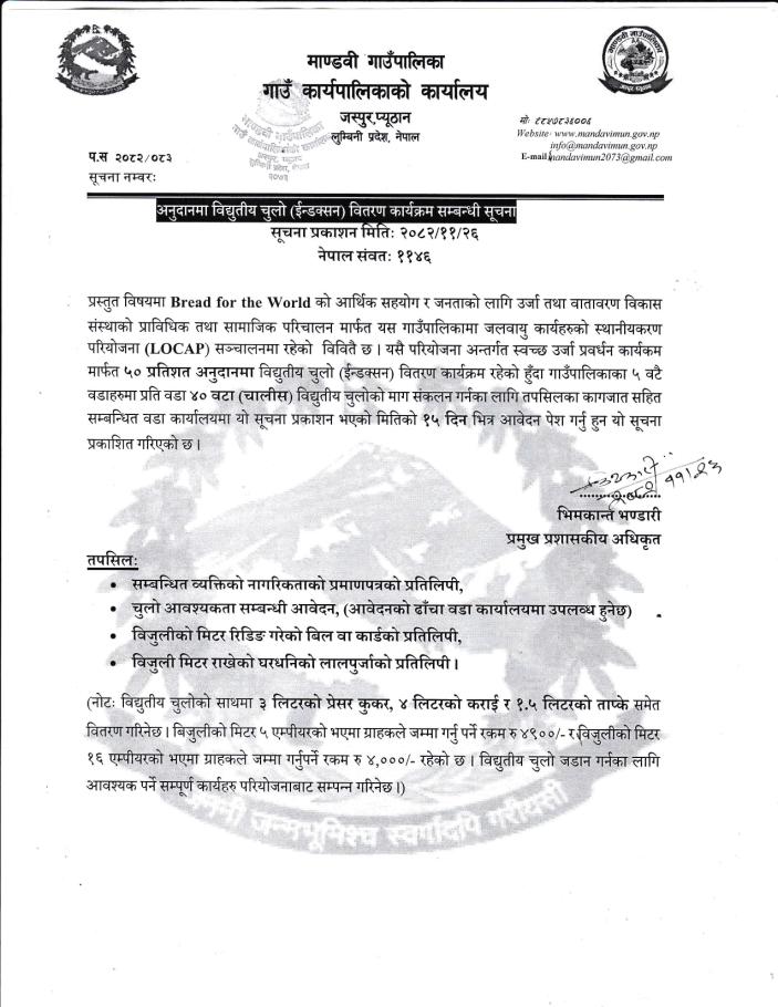 अनुदानमा विद्धुतिय चुलो (इन्डक्सन) वितरण कार्यक्रम सम्बन्धी सूचना
