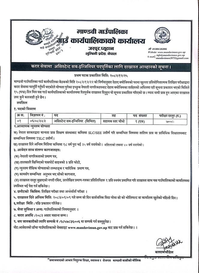 Home » करार सेवामा असिस्टेन्ट सब इन्जीनियर पदपूर्तिका लागि दरखास्त आव्हानको सूचना