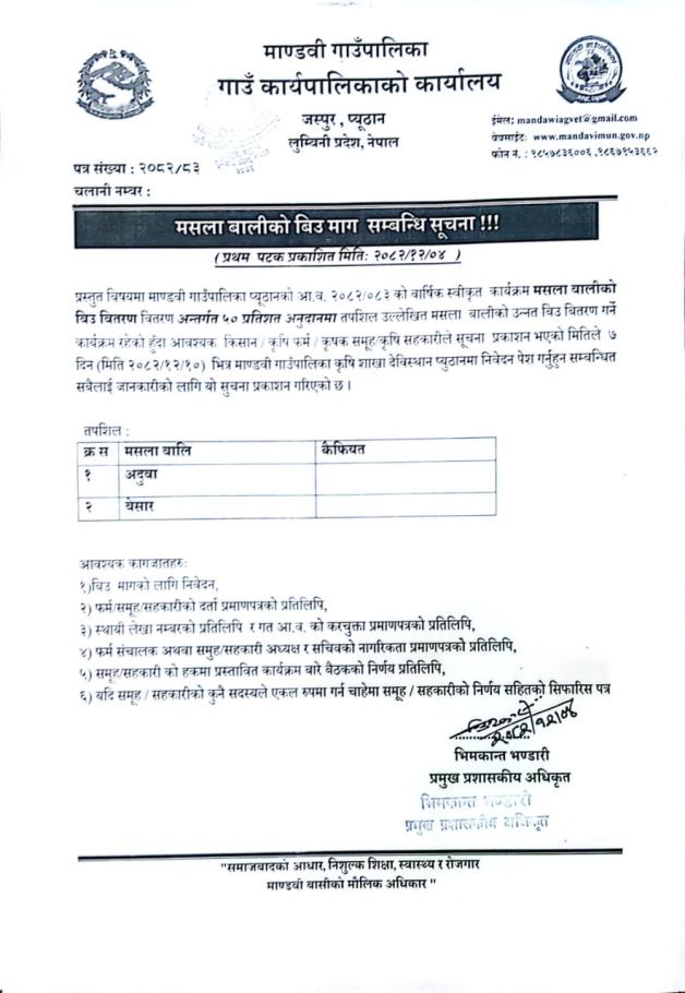 खाद्यान्न बालि र मसला बालीको बिउ माग सम्बन्धी सूचना