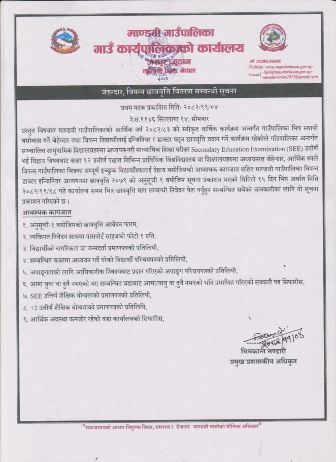 जेहेन्दार बिपन्न छात्रवृत्ति वितरण सम्बन्धी सूचना