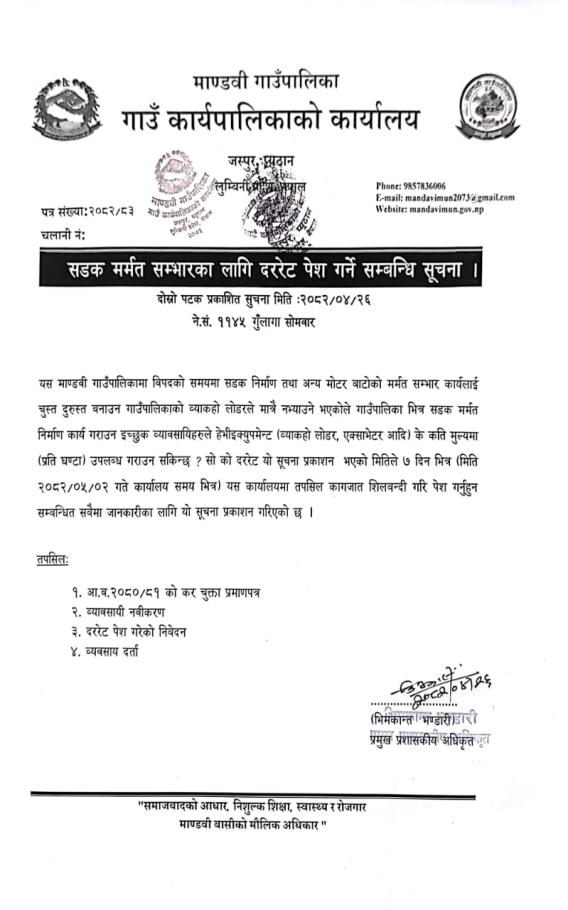 सडक मर्मत सम्भारका लागि दररेट पेश गर्ने सम्बन्धी सूचना