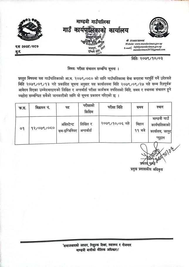 असिस्टेन्ट सब इन्जिनियर पदको लिखित परीक्षाको संचालन सम्बन्धी सूचना
