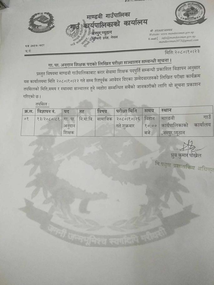 गा.पा अनुदान शिक्षक पदको लिखित परीक्षाको संचालन सम्बन्धी सूचना