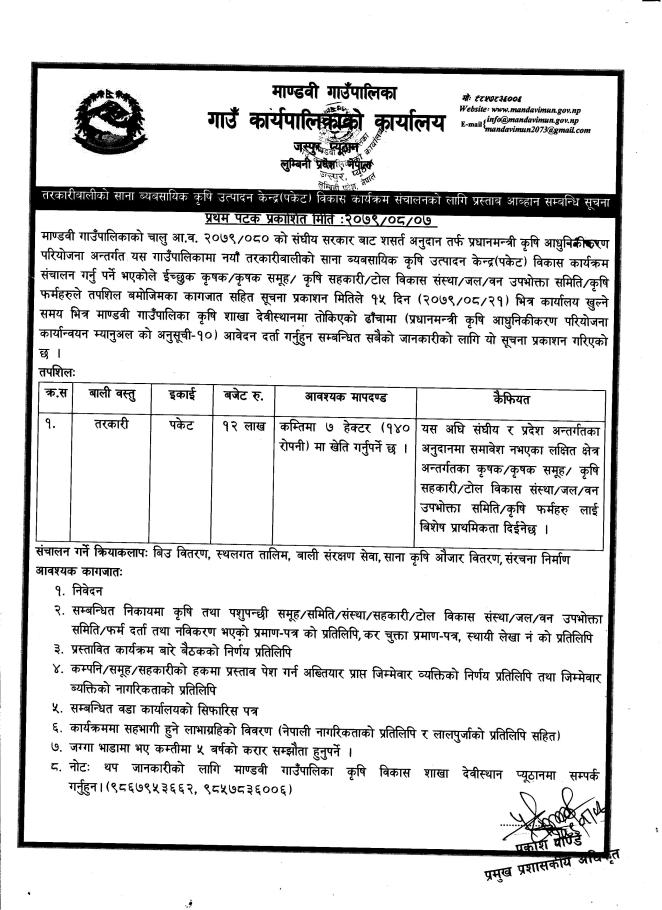 च्याउ तथा तरकारीबालीको साना व्यवसायिक कृषि उत्पादन केन्द्र (पकेट) विकास कार्यक्रम संचालनका लागि प्रस्ताव आव्हान सम्बन्धी सूचना