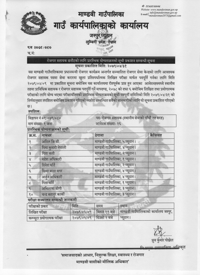 रोजगार सहायक छनौटको लागि प्रारम्भिक योग्यताक्रमको सुची प्रकाशन सम्बन्धि सूचना