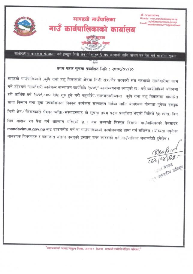 साझेदारीमा कार्यक्रम संचालन गर्न इच्छुक निजी क्षेत्र/गैरसरकारी संघ संस्थाको लागि आशय पत्र पेश गर्ने सम्बन्धि सूचना